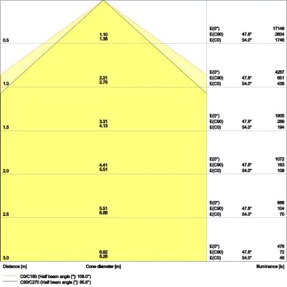Beispiel: Wird eine Lampe mit einem Abstrahlwinkel von 60 Grad an der Decke (2,5 m Höhe) angebracht, erzeugt sie einen Lichtkegel von 2,9 Metern Durchmesser. Hat die Lampe hingegen einen Abstrahlwinkel von 120 Grad, beträgt der Lichtkegel 8,7 Meter im Durchmesser. |
