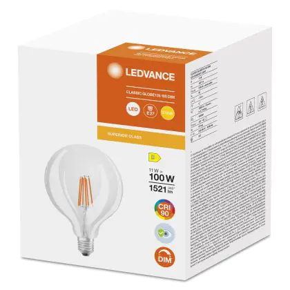 Die Ledvance Superior Classic LED E27 Globe Fadenlampe Klar 11W 1521lm - 927 Extra Warmweiß | Höchste Farbwiedergabe ist eine effiziente E27 LED-Lampe mit Retrodesign und der perfekte Ersatz für Ihre konventionellen 100W Lampen mit E27. Zudem strahlt sie Licht in der Farbtemperatur 2700K - Extra Warmweiß aus und punktet durch eine lange Lebensdauer.