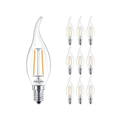 Mehrfachpackung 10x Philips Corepro LED Kerze E14 Gebogen-tip Fadenlampe Klar 2W 250lm - 827 Extra Warmweiß | Ersatz für 25W