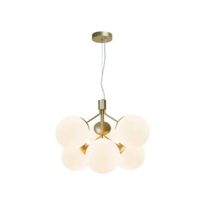 Bei der Pendelleuchte Ivona handelt es sich um eine Neuinterpretation eines klassischen Kronleuchters, wobei das traditionelle Design durch einen etwas organischeren und moderneren Look akzentuiert wird. Mit 6 Glaskugeln strahlt Ivona ein tolles Licht aus, das für einen modernen und extravaganten Stil sorgt. Die Kombination aus Messing und Opalglas schafft einen glamourösen und eleganten Designausdruck. Das Glas dieser Leuchte ist mundgeblasen und handgefertigt. Aufgrund dieses einzigartigen Verfahrens können im Glas Luftblasen entstehen und die Dicke des Glases kann ebenfalls variieren. Dies verleiht dem Glas seinen einzigartigen Charakter und sein lebendiges Erscheinungsbild.