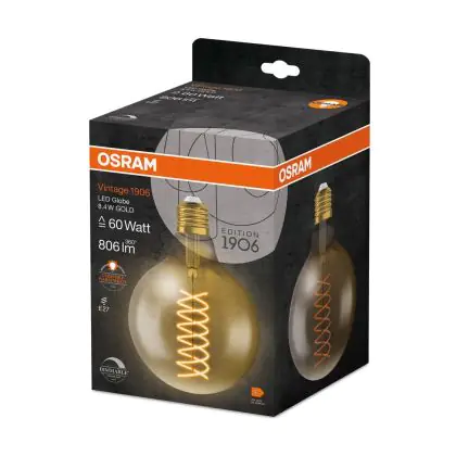 Die Osram Vintage 1906 LED E27 Globe Fadenlampe Gold 8.4W 806lm - 824 Extra Warmweiß | Ersatz Für 60W - Dimmbar ist eine effiziente E27 LED-Lampe mit Retrodesign und der perfekte Ersatz für Ihre konventionellen 60W Lampen mit E27. Zudem strahlt sie Licht in der Farbtemperatur 2400K - Extra Warmweiß aus und punktet durch eine lange Lebensdauer.