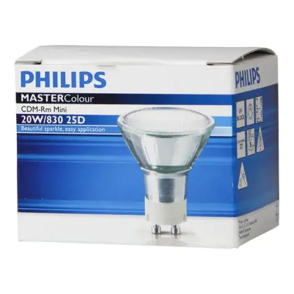 CDM-Rm Mini sind mit einem Reflektor ausgestattet, der das Licht in eine bestimmte Richtung reflektieren kann. Sie können die CDM-Rm Mini mit verschiedenen Strahlungswinkeln erhalten: 10D, 25D und 40D. Hierbei ist ein Strahlungswinkel von 10D für eine Akzentbeleuchtung geeignet. 40D impliziert eine weite Streuung des Lichts. Die Philips CDM-R Mini 20W 830 GX10 MR16 25D (MASTERColour) sind Entladungslampen und besitzen einen GX10 Lampensockel. Sie können die Lampe auf sehr einfache Art in Ihrer Armatur installieren.